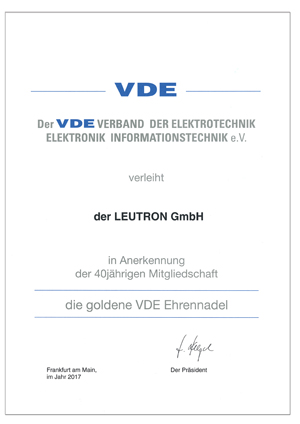 40 Jahre Mitglied im VDE Festliche Ehrung für langjährige Mitglieder Im Rahmen der Mitglieder Jahresversammlung am 9. Mai 2017 wurde der Firma Leutron für 40-jährige Mitgliedschaft im VDE die Goldene Ehrennadel mit Ehrenurkunde verliehen. In den Räumen der Technischen Akademie Esslingen nahm Geschäftsführer Herr Jörg Jelen die Ehrung durch den VDE Bezirksverein Württemberg e.V. entgegen.