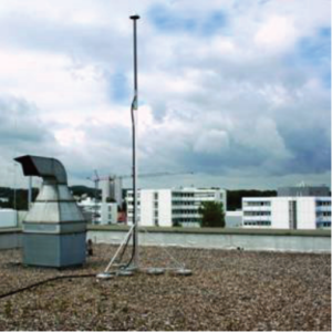 Wenn schon gebaut wird, dann auch optisch ansprechend, dachte sich die Fraunhofer Gesellschaft, als es um die Neugestaltung im Institutszentrum Stuttgart ging. Die Architektur des modernen Kantinenbaus, der direkt in der Sichtachse der Besucher steht, wird entsprechend von großen Glasflächen und Holz dominiert. Problematisch allerdings: Auf dem Gebäude sollte keine Blitzschutzanlage zu sehen sein, sie hätte das Gesamtkonzept zu sehr gestört. Kurzerhand lagerten die Ingenieure in Abstimmung mit dem Bauherrn den Ableiter auf ein höheres Nachbargebäude aus. Möglich machte dies ein innovatives Blitzschutzkonzept aus den USA. Das Institutszentrum Stuttgart (IZS) ist das zweitgrößte Forschungszentrum der Fraunhofer Gesellschaft in Deutschland. Sechs Institute sind hier zentral versammelt, von der Arbeitswirtschaft über Bauphysik und Produktionstechnik bis hin zur Technologie-Entwicklungsgruppe. Treffpunkt für Forscher aller wissenschaftlichen Richtungen ist die neugebaute Kantine des IZS. Mit riesigen Glasflächen, Holzelementen und einem weiten Balkon bietet sie nicht nur Raum für gemütliche Pausen, sondern tritt auch Besuchern des Zentrums direkt als offener und einladender Bau entgegen. Nichts sollte diesen ersten Eindruck stören, auch keine Blitzschutzinstallation auf dem Dach. Hinzu kam ein Problem mit der baulichen Gestaltung: „Da das Gebäude auf Stützen gebaut ist, hätte man bei einem herkömmlichen Blitzschutz die Ableitung an der Außenseite herunterführen müssen – eine potentielle Gefahr für Passanten“, so Rolf Rogg vom Ingenieurbüro Schwarz in Stuttgart, das für die Elektroplanung der Kantine verantwortlich war. Zudem stand in der Planungsphase nicht fest, ob der alte Kantinenbau, über dem der neue errichtet wurde, nicht noch abgerissen würde, weshalb die bestehenden notwendigen Ableiter und Erdungseinrichtungen nicht mehr genutzt und in die Planung einbezogen werden konnten.